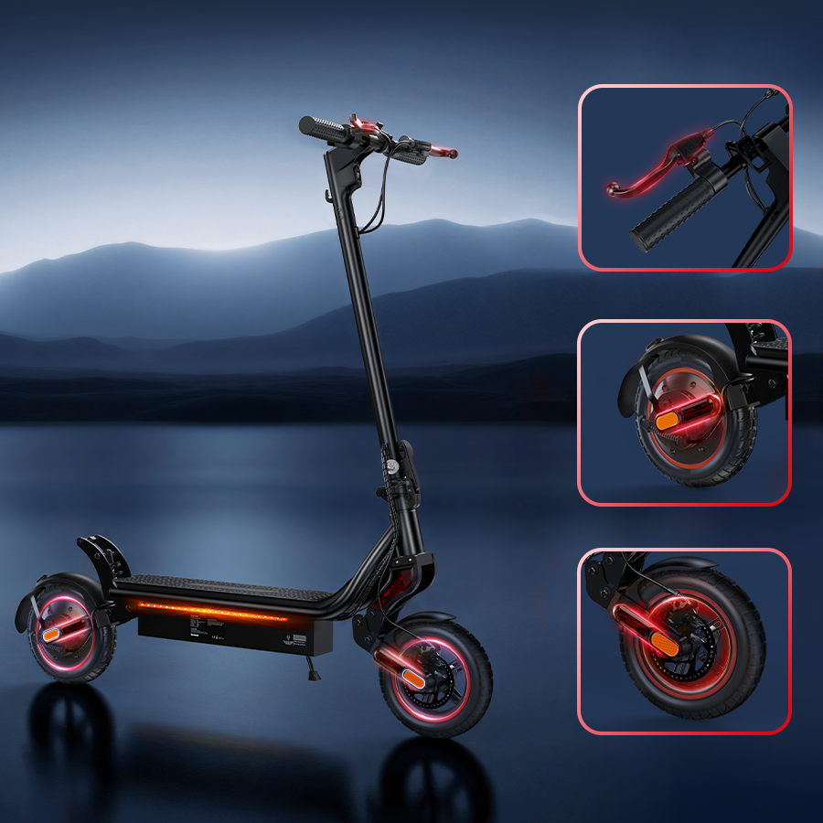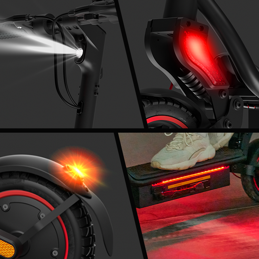 La trottinette dispose de phares, clignotants, feux arrière et éclairage ambiant, assurant une excellente visibilité. C’est indispensable pour la sécurité en hiver ou en zones peu éclairées.