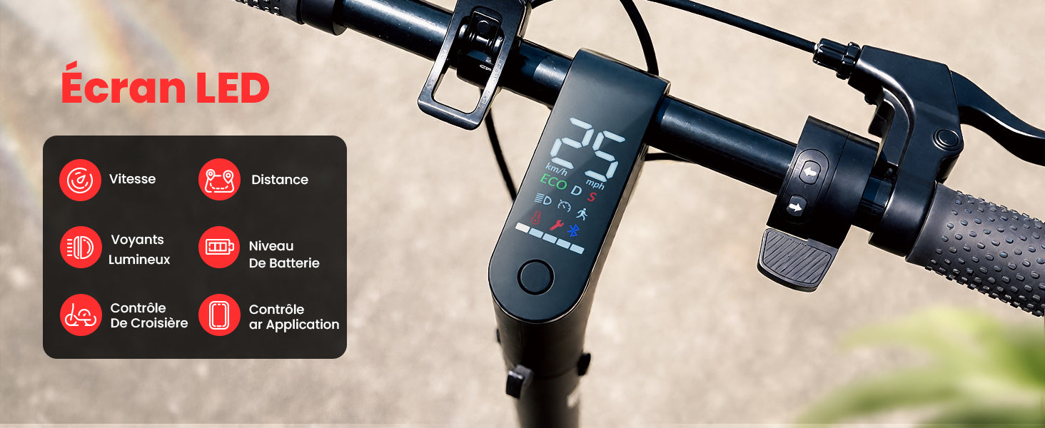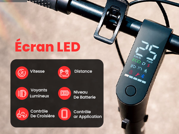 | Informations sur l'écran LED | Vitesse actuelle, niveau de batterie, connexion Bluetooth, position de vitesse, entretien, température, etc. |