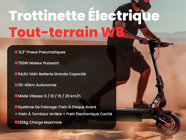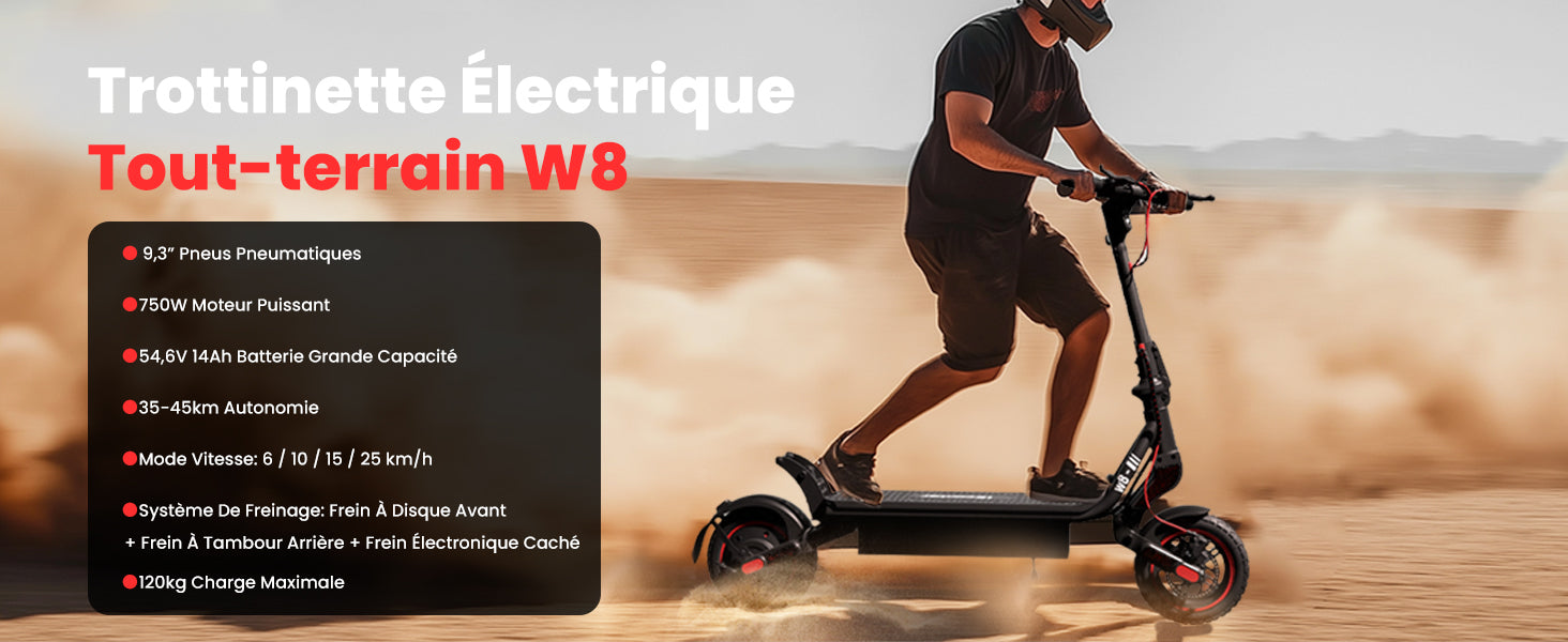 Le scooter électrique tout-terrain W8 vous permet de dompter tous les terrains avec une puissance et une fiabilité inébranlables, transformant chacune de vos aventures ou trajets du quotidien en un jeu d'enfant.