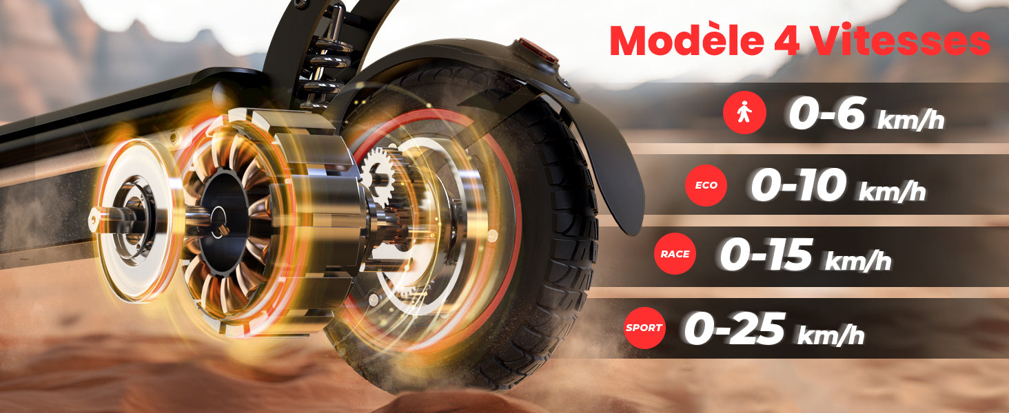 Les modes plus rapides (30–40 km/h) sont réservés aux terrains privés.